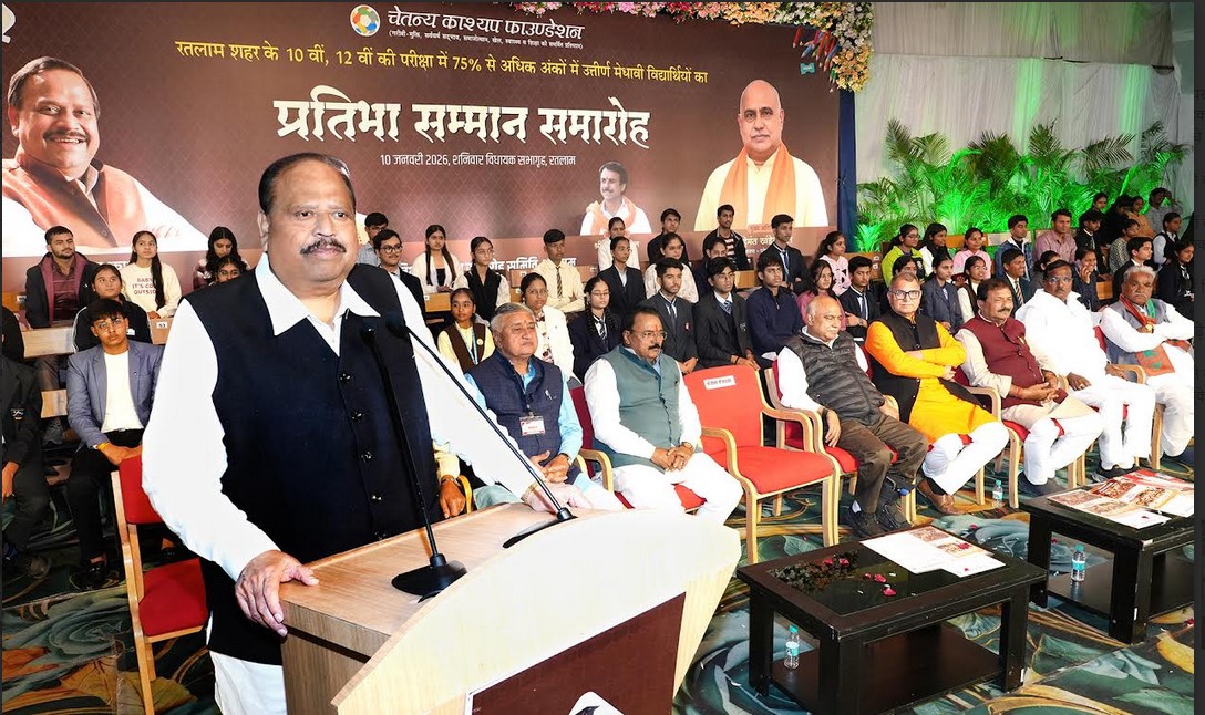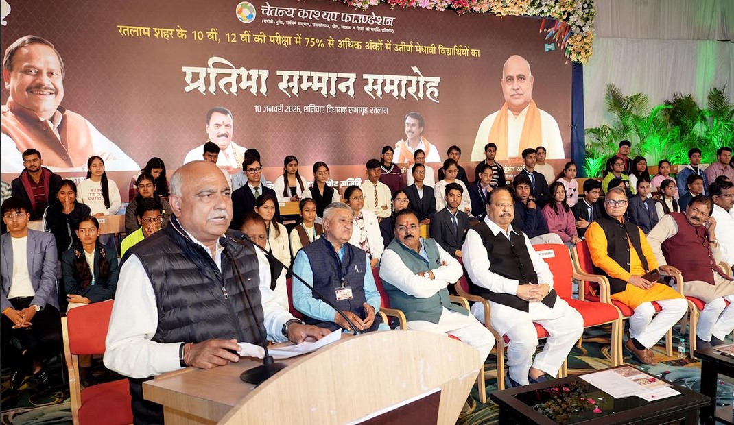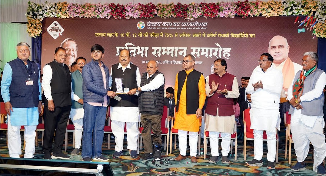 खबरगुरु (रतलाम) 10 जनवरी। चेतन्य काश्यप फाउंडेशन द्वारा आयोजित प्रतिभा सम्मान समारोह में प्रदेश भाजपा अध्यक्ष हेमंत खंडेलवाल के मुख्य आतिथ्य में 2500 से अधिक मेधावी विद्यार्थियों को सम्मानित किया गया। बरबड़ स्थित विधायक सभागृह पर आयोजित समारोह की अध्यक्षता कैबिनेट मंत्री, फाउंडेशन अध्यक्ष चेतन्य काश्यप ने की। विशेष अतिथि भाजपा जिलाध्यक्ष प्रदीप उपाध्याय रहे। इस अवसर पर संभाग प्रभारी सुरेश आर्य, जिला प्रभारी प्रदीप पांडेय, उज्जैन विधायक अनिल जैन कालूहेड़ा, ग्रामीण विधायक मथुरालाल डामर, आयोजन समिति सलाहकार पूर्व महापौर शैलेंद्र डागा, निर्मल लुनिया मंचासीन रहे।