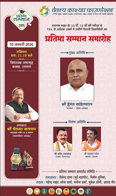 फाउंडेशन अध्यक्ष, कैबिनेट मंत्री चेतन्य काश्यप द्वारा नगर की प्रतिभाओं को प्रोत्साहित करने के उद्देश्य से प्रतिभा सम्मान समारोह आयोजित किया जाता है। शिक्षा सत्र 2024-25 के प्रतिभा सम्मान समारोह में 10वीं और 12वीं की बोर्ड परीक्षा में 75 प्रतिशत और उससे अधिक अंक लाने वाले मेधावी विद्यार्थियों का सम्मान किया जाएगा। 93 प्रतिशत एवं इससे अधिक अंक प्राप्त करने वाले 121 मेधावी विद्यार्थी अतिथियों के साथ मंच साझा करेंगे। सभी मेधावी विद्यार्थियों को अभिभावकों की उपस्थिति में रिस्ट वॉच एवं शील्ड से सम्मानित किया जाएगा। विद्यार्थी अपने कूपन साथ लेकर कार्यक्रम स्थल पहुंचकर पुरस्कार प्राप्त कर सकेंगे।