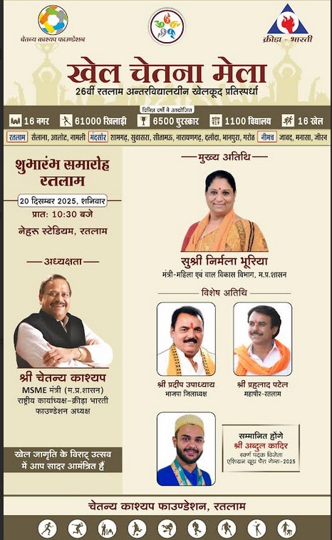 खबरगुरु (रतलाम) 19 दिसंबर। क्रीड़ा भारती एवं चेतन्य काश्यप फाउंडेशन के तत्वावधान में 20 से 23 दिसंबर तक आयोजित होने वाले खेल चेतना मेला का भव्य शुभारंभ शनिवार को होगा। नेहरू स्टेडियम में आयोजित समारोह में मुख्य अतिथि महिला एवं बाल विकास विभाग मंत्री निर्मला भूरिया होगी, विशेष अतिथि महापौर प्रहलाद पटेल एवं भाजपा जिलाध्यक्ष प्रदीप उपाध्याय रहेंगे। कार्यक्रम की अध्यक्षता क्रीड़ा भारती के राष्ट्रीय कार्याध्यक्ष, फाउंडेशन अध्यक्ष एवं सूक्ष्म, लघु एवं मध्यम उद्यम मंत्री चेतन्य काश्यप करेंगे। इस अवसर पर एशियन यूथ पैरा गेम्स में स्वर्ण पदक विजेता अब्दुल कादिर भी सम्मानित होंगे।