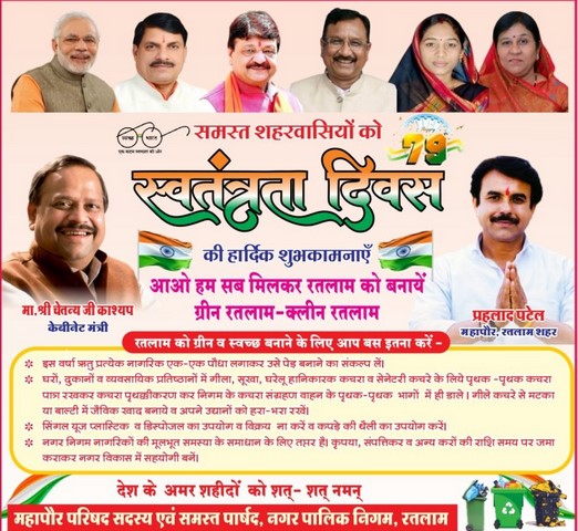 खबरगुरु (रतलाम) 15 अगस्त। 15 अगस्त स्वतंत्रता दिवस हर्षोल्लास एवं गरिमा के साथ मनाया गया। इस अवसर पर पूरे जिले में तिरंगा झंडा फहराया गया। मुख्य समारोह रतलाम में स्थानीय पुलिस लाइन मैदान पर आयोजित हुआ। मुख्य समारोह में मुख्य अतिथि जनजातीय कार्य, लोक परिसंपत्ति प्रबंधन एवं भोपाल गैस त्रासदी राहत एवं पुनर्वास विभाग मंत्री मध्य प्रदेश शासन डॉ कुंवर विजय शाह ने ध्वजारोहण किया एवं परेड की सलामी ली। मुख्य समारोह में मुख्यमंत्री डॉ मोहन यादव के संदेश का लाइव प्रसारण किया गया। मुख्य अतिथि द्वारा बधाई संदेश का वाचन किया गया।